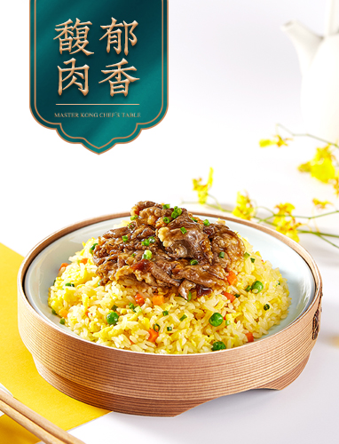 優(yōu)選大米搭配雞蛋及胡蘿卜在大火翻炒下粒粒分明,色澤金黃。再加上紅蔥醬入味的上等肥牛,呈現(xiàn)出米香、肉香、食材香,融為一體的黃金炒飯。