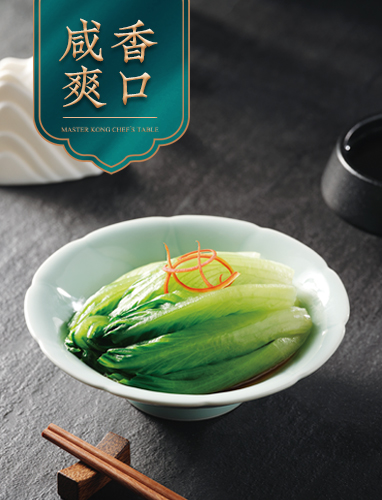 優(yōu)選花葉生菜以大火燙熟,生菜色澤翠綠、口感脆嫩,最后淋上白灼汁,口味咸鮮爽口,回味無窮。