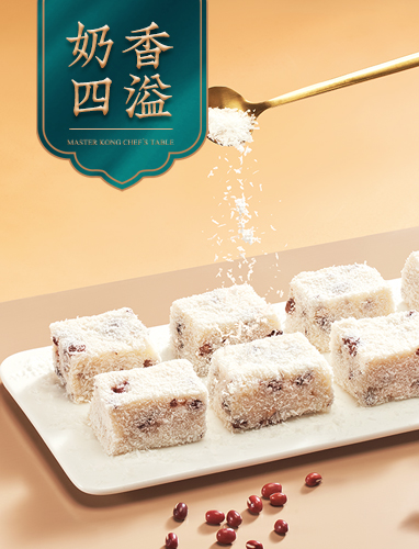 香濃椰奶與甘甜紅豆的美妙結合! 糕點潔白一如凝脂,輕嘗一口,軟嫩誘人奶香四溢,令人無法拒絕。